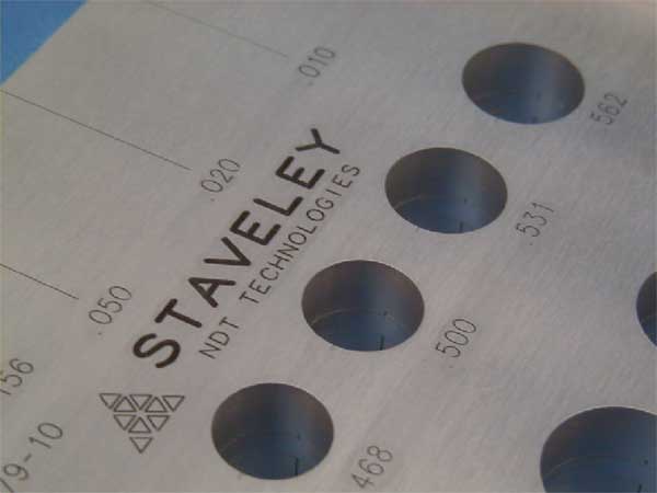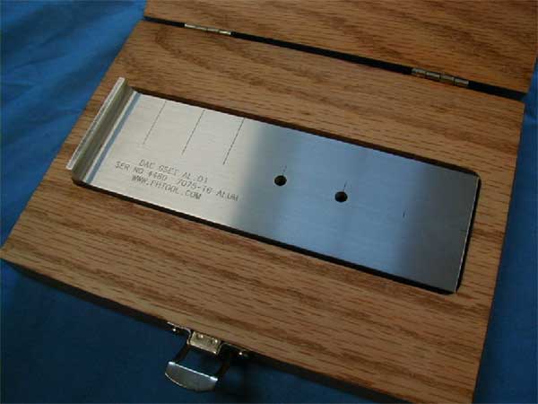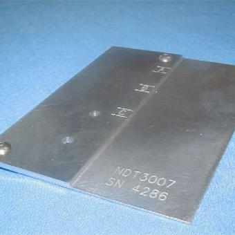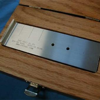 Standard is a three (3) plate assembly measuring 4" x 7" x 1.06". Contains twenty (20) fastener holes with diameters from 0.156 to 0.750", two (2) screw holes, and two (2) dowel pins holes. Standard also contains a total of 66 EDM notches in various locations. Notch depth and length vary. Width is 0.004" for all notches. Material is Aluminum Alloy 7075-T6, QQ-A-250/12. Finished standard is anodized per MIL-A-8625, Type II, Class I. Standard can also be made in titanium, steel, stainless steel or other alloy. These reference standards are manufactured in accordance with U.S.A.F. Tech Order 33B-1-1, Figures 4-47 through 4-49. NSN 6635-01-092-5129, P/N 7947479-10. Standard is normally in stock. Call 267.203.1600 for current pricing or see what we have in stock in our online store.