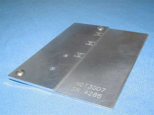 This standard is called out in the recent Alert Service Bulletin (ASB) 407-01-48. PH Tool is the suggested manufacturer of this item. It is made from 2024-T3 aluminum sheet and measures .040" thick x 2.5" x 5.0". It contains two through holes at 0.172" diameter, and two at .203". Total of five EDM slots are included at .004" wide x .020" and .040" long and are machined through the .040" sheet thickness. This Eddy Current Reference Standard is machine-engraved with the standard no. (EC-10-20), alloy, serial number, and PH Tool. Standard is normally in stock. Call 267.203.1600 for current pricing.
